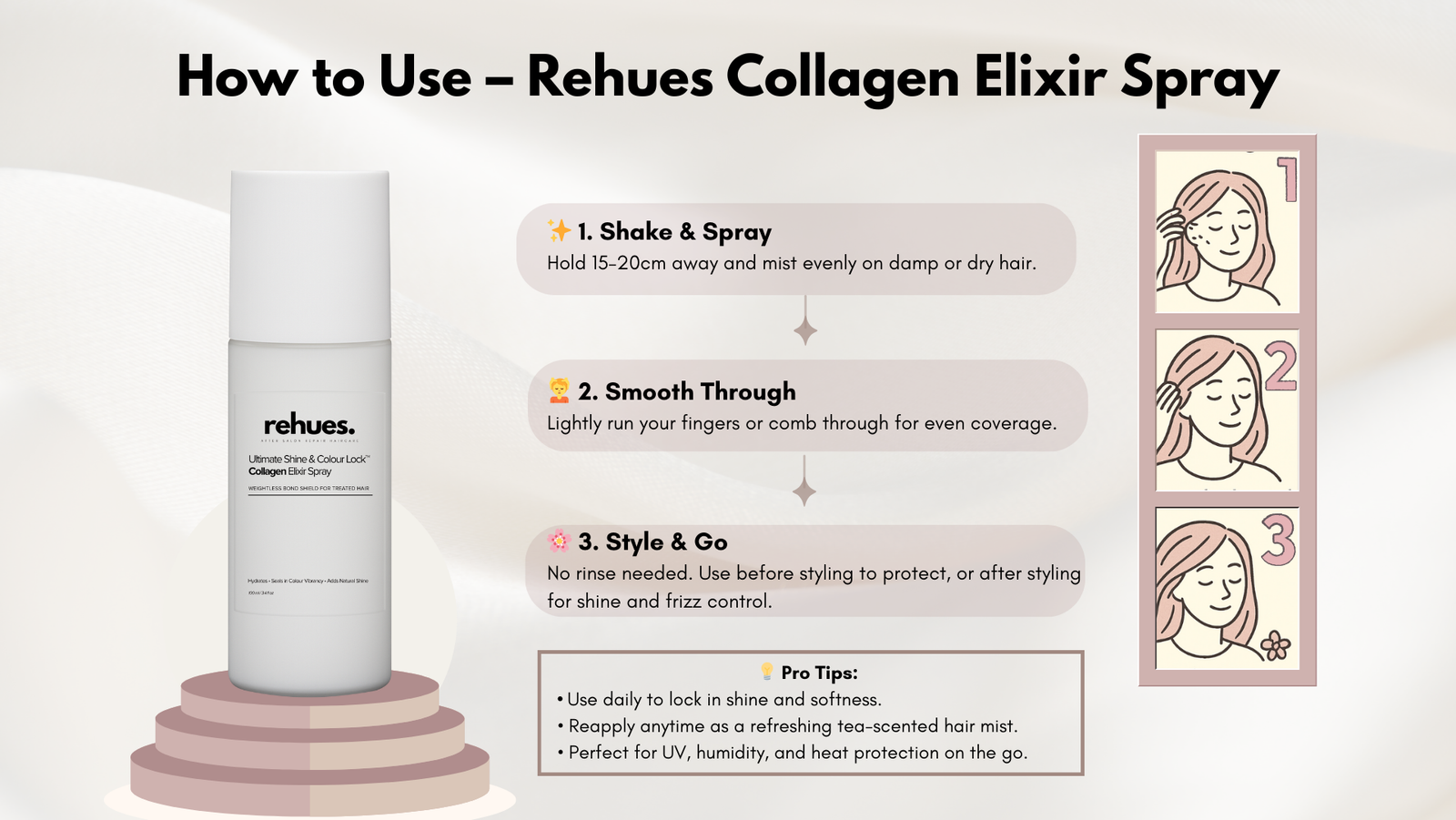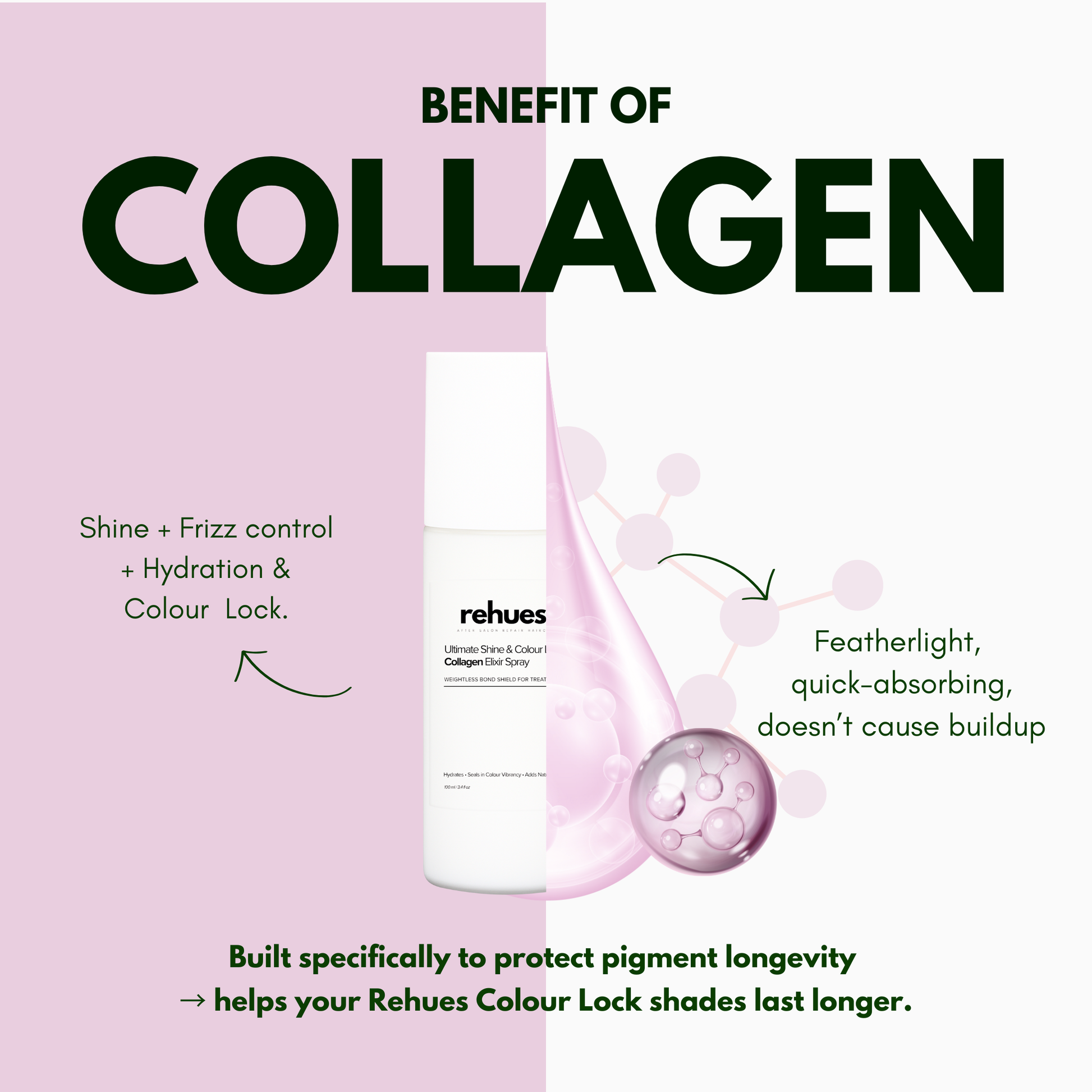 Lock in salon-fresh colour and shine with our weightless collagen elixir spray — designed to hydrate, protect, and seal vibrancy in just one spritz.